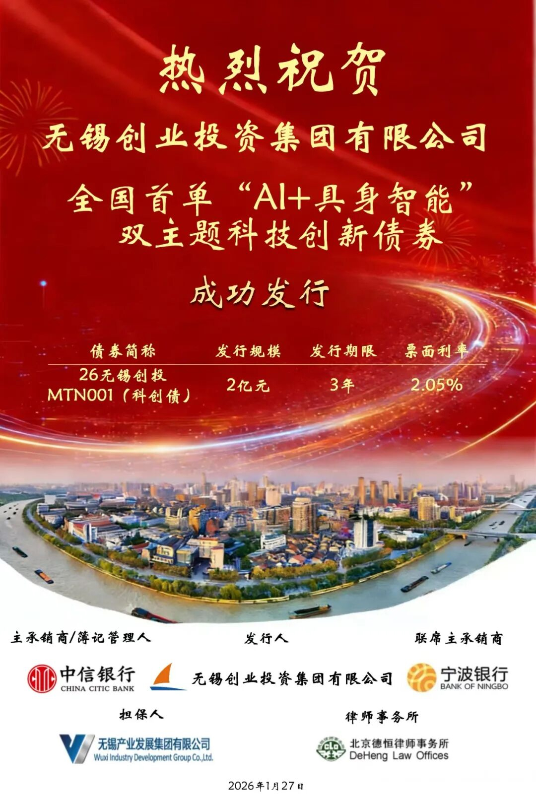 1月27日,全国首单同时聚焦“人工智能”与“具身智能”的主题科技创新债券在锡发行。无锡创业投资集团有限公司成功发行2026年第一期中期票据,规模2亿元,集中投向人工智能与具身智能赛道。这是继去年成功发行全国首批科技创新债券后,创投集团再次运用金融创新工具,精准引导社会资本投向科技前沿,为无锡乃至长三角地区关联产业发展注入动能。
